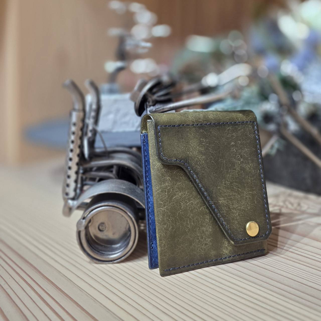 カラー: メイン→わび緑 サブ→青 金具→真鍮 ステッチ→紺系